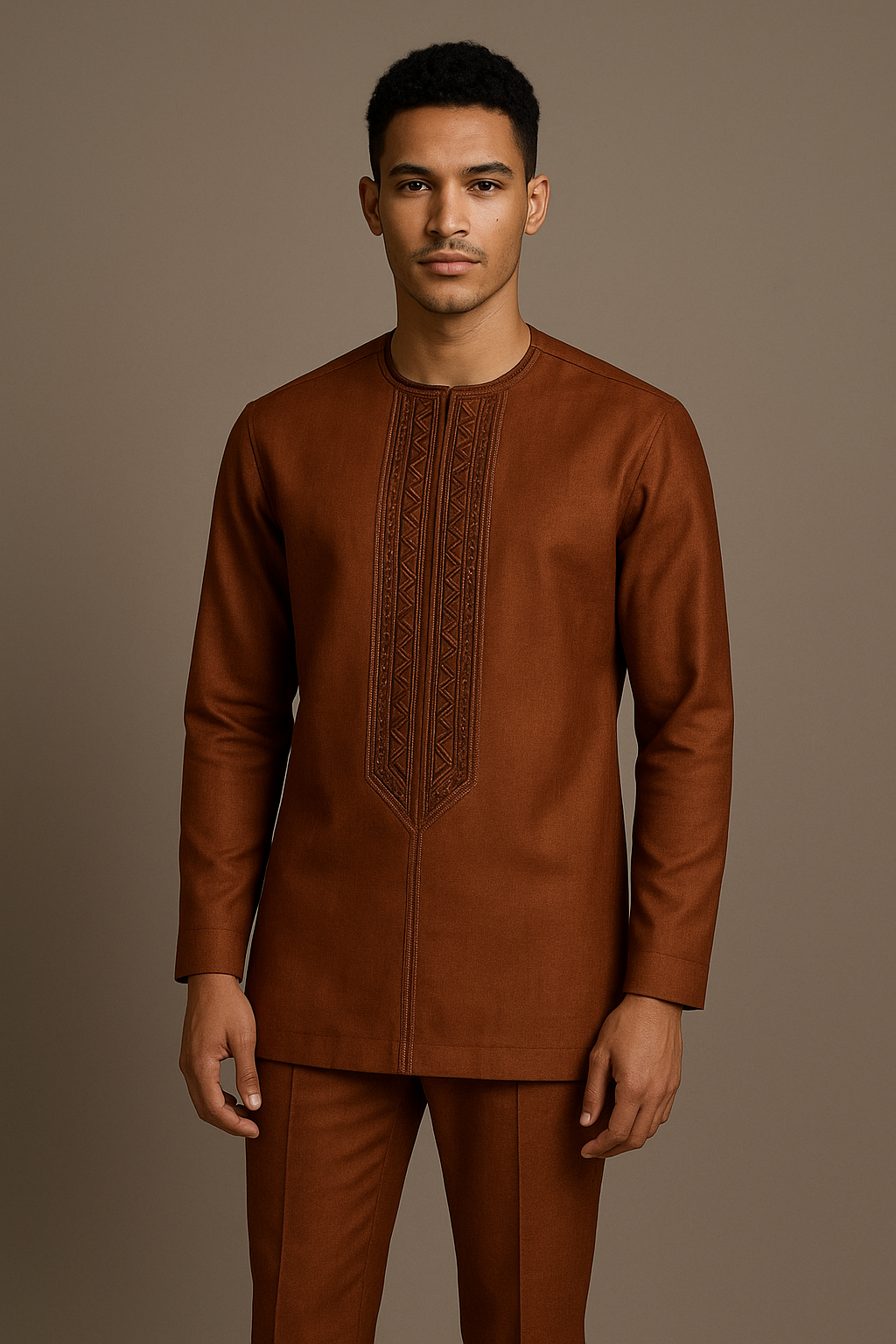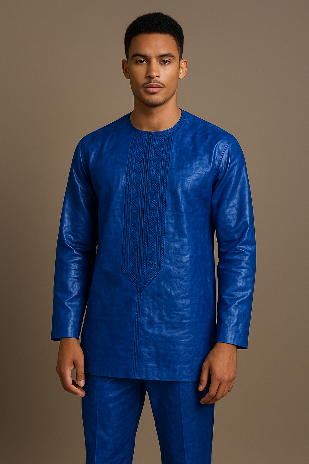 Découvrez cette magnifique tenue traditionnelle africaine dans un somptueux bleu royal éclatant et marron. Cet ensemble deux-pièces incarne l’élégance intemporelle et le raffinement de l’artisanat africain contemporain, parfait pour l’homme moderne qui célèbre ses racines avec style.